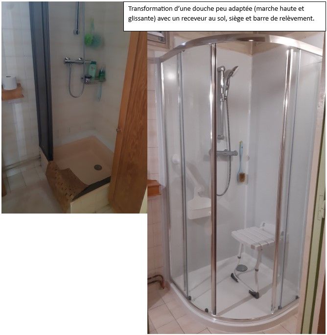 Adaptations pour une douche sûre et confortable, en remplacement d'une baignoire devenue source de chutes potentielle.