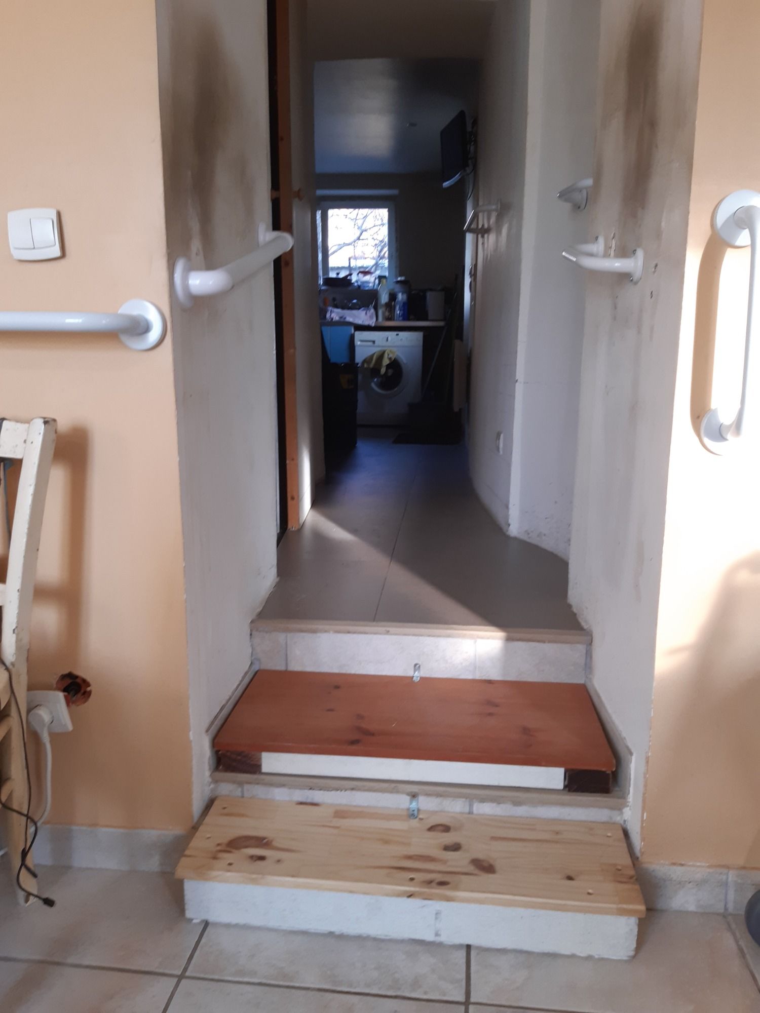 Douche sécurisée, WC PMR à la place du bidet, sèche-serviettes, sol anti glisse, large porte coulissante pour accès fauteuil...