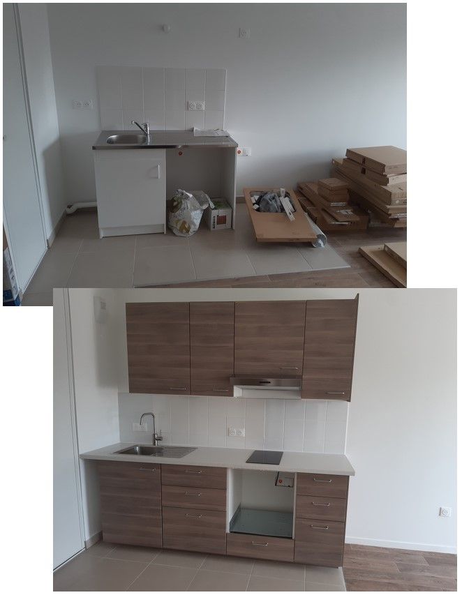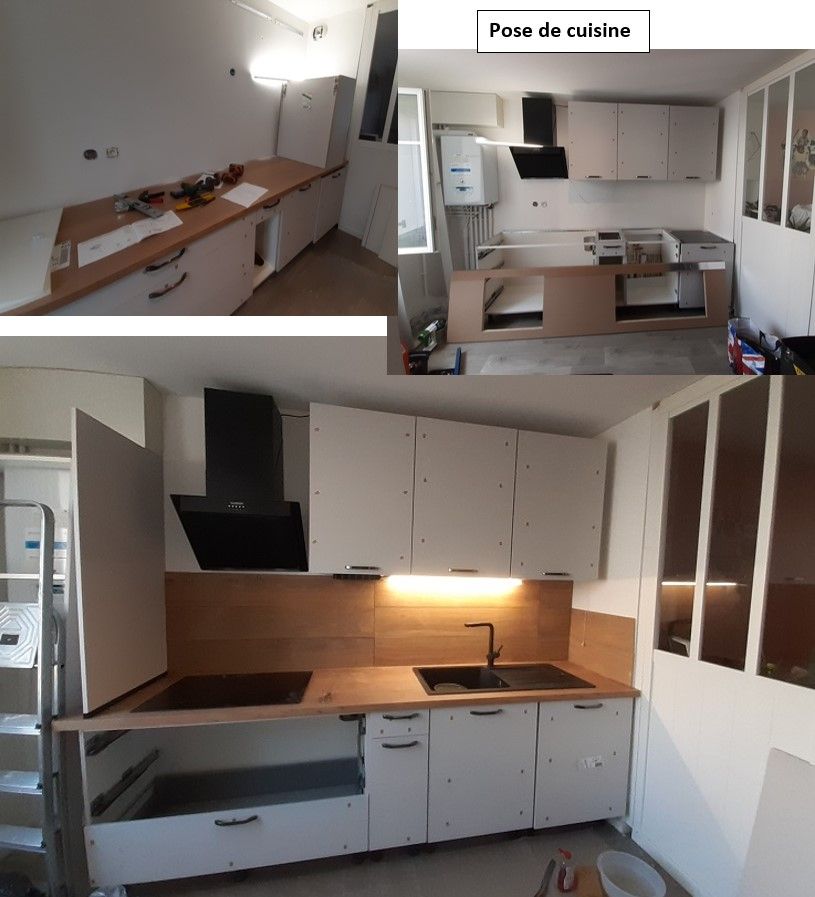 Montage et pose d'une cuisine : éléments bas, éléments hauts, découpe du plan de travail, électroménager et évier intégrés.